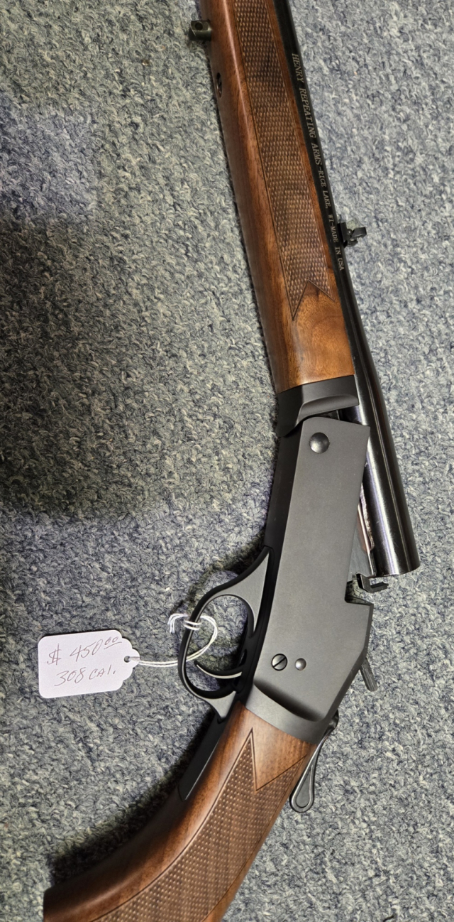 This 308 Cal. rifle is a NEW IN THE BOX Henry Single Shot. 22" barrel with fold down rear sight and brass bead front sight. $450.00. rmgrigoletto@yahoo.com 732 280 8750.