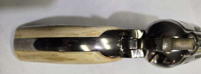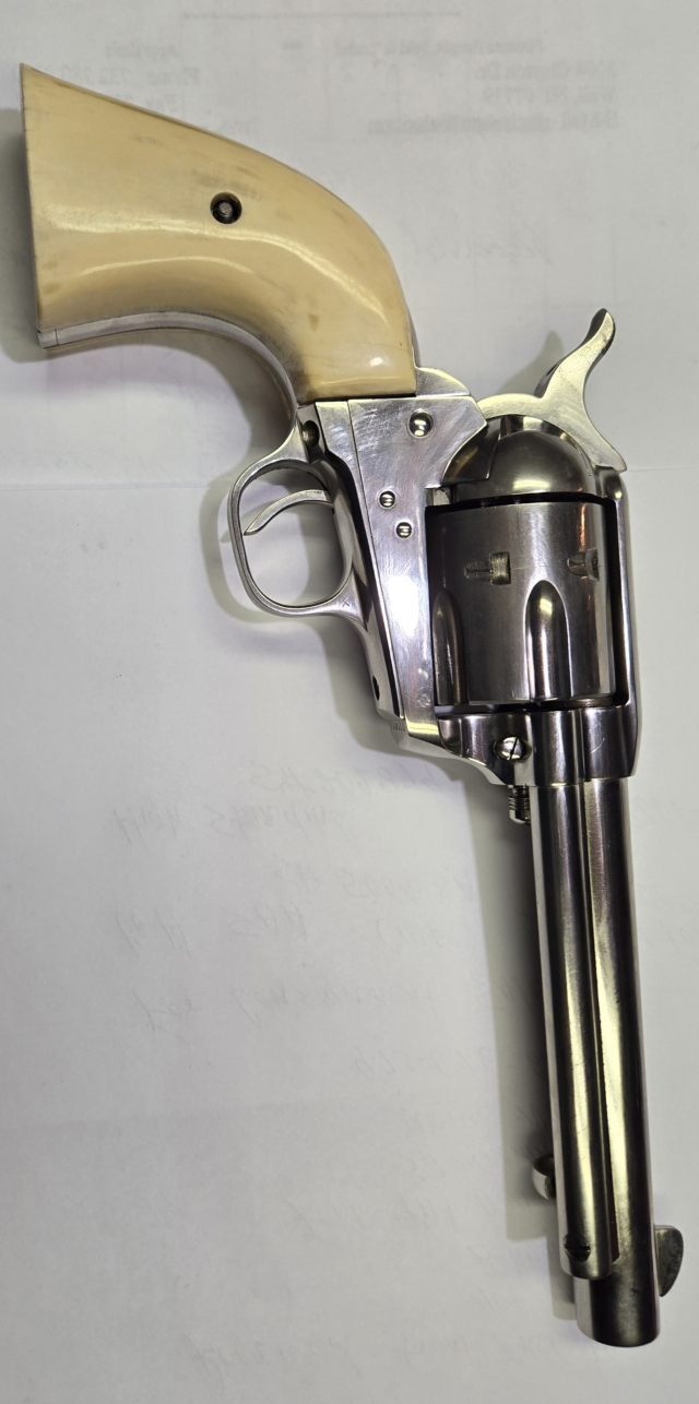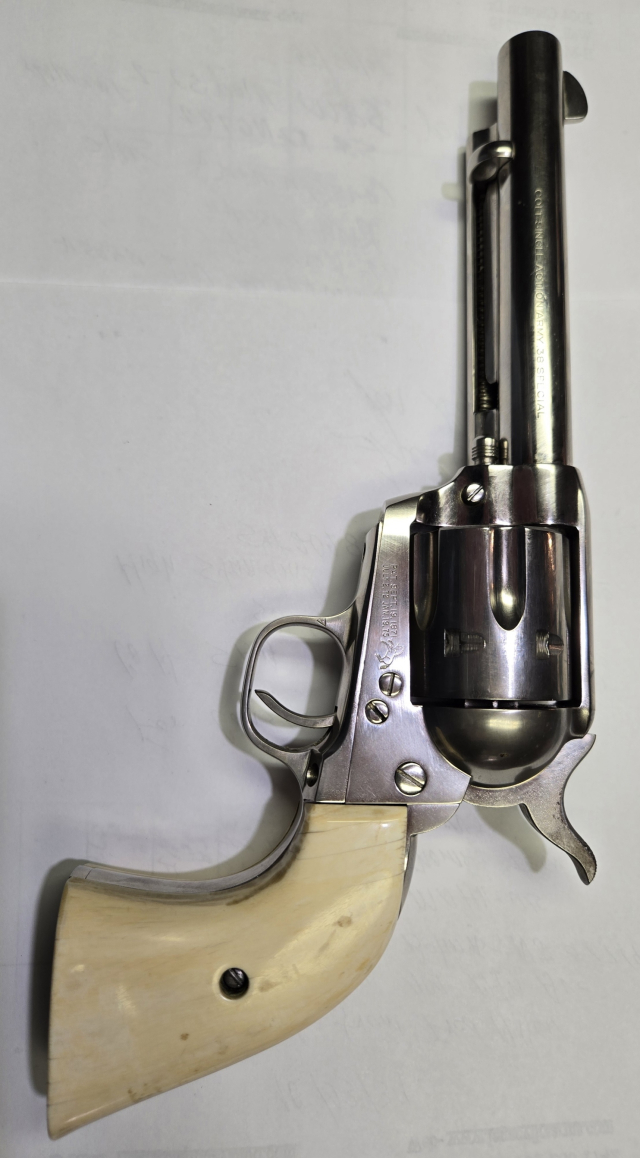 This .38 Special revolver is a 2nd. Generation Colt SAA with a 5 1/2" barrel. (Mfg. 1969) Nickel finish with a dull area behind the cylinder on the left side. Locks up tight. $2500.00. rmgrigoletto@yahoo.com 732 859 6066. |