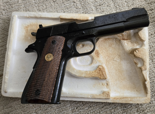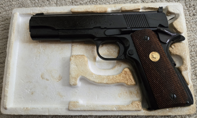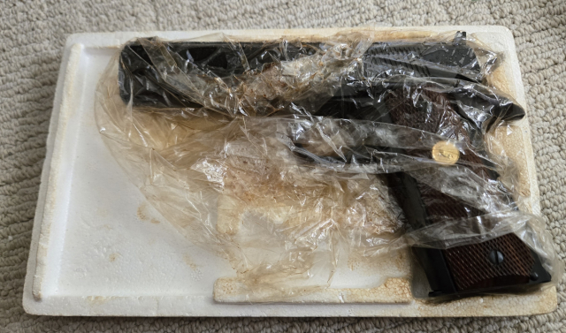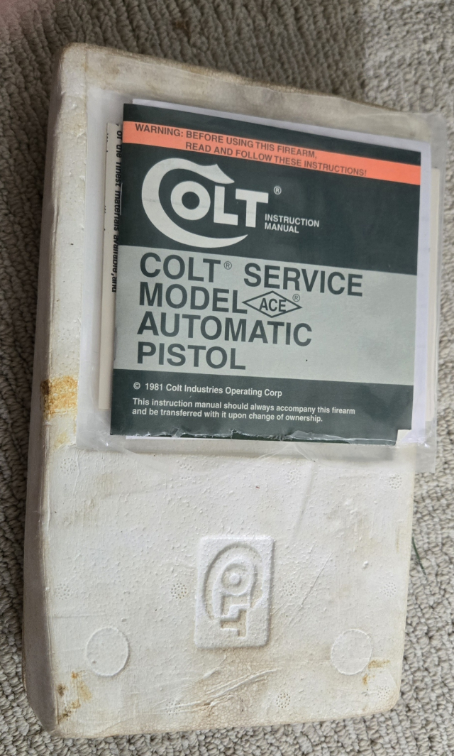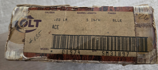 This .22 Cal pistol is a COLT ACE. (Mfg 1978). UNFIRED and still wrapped in cosmoline. Comes in a tattered orignal box with manual. S# SM318XX. $1950.00. rmgrigoletto@yahoo.com 732 859 6066.
